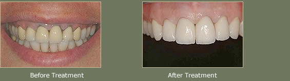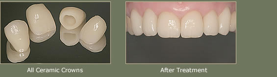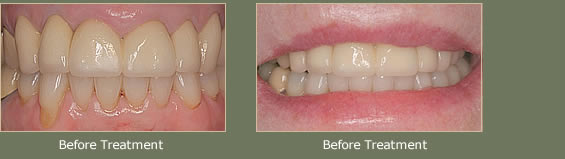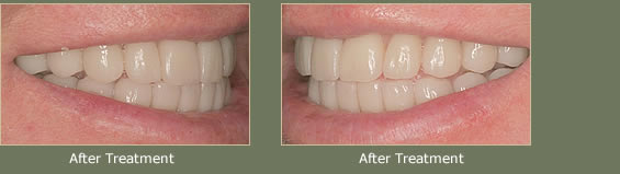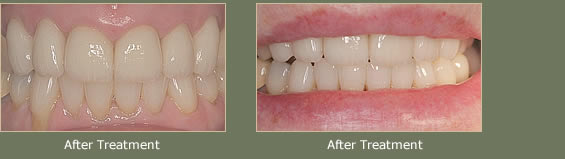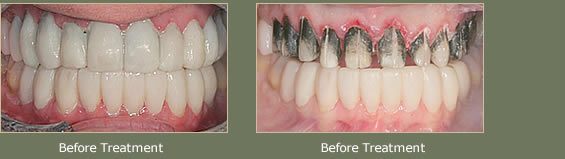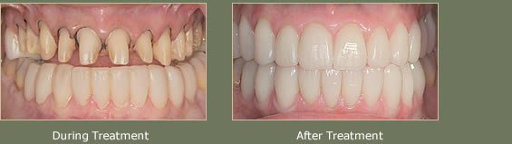 The image above left shows preparation of the teeth for new crowns. The image above right shows completion of crowns on the upper and lower teeth.