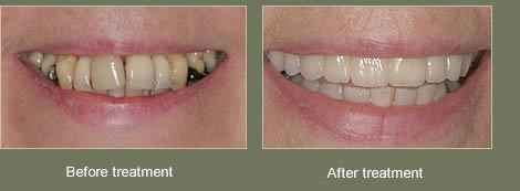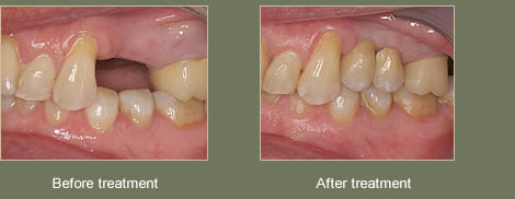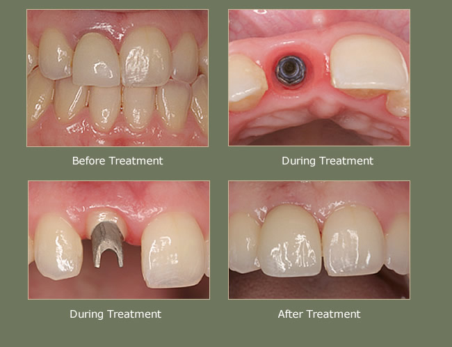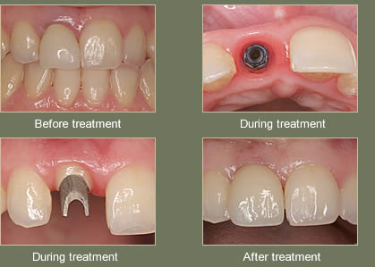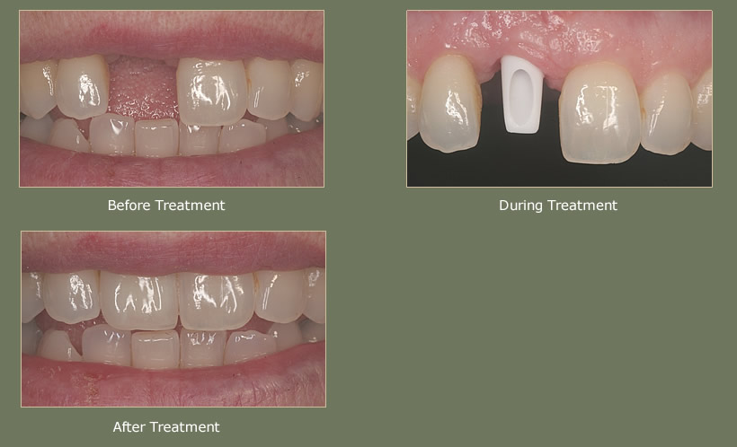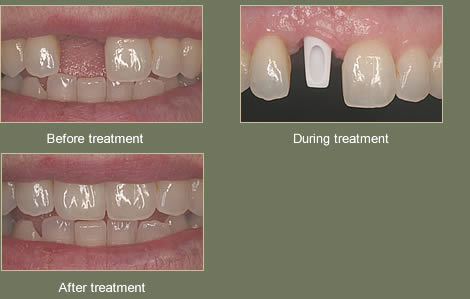 Replacement of the missing upper right central incisor tooth (click to enlarge)