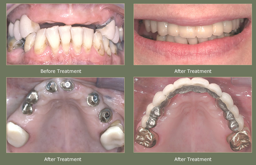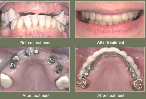 Failing upper teeth replaced with a full arch implant supported bridge (click to enlarge)