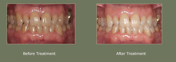 In this case the discoloured and chipped upper front two teeth have been restored using a combination of tooth whitening and composite bonding (click to enlarge)